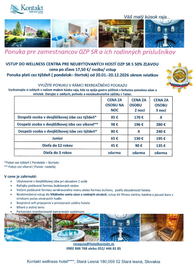 Kontakt Wellness Hotel poskytuje pre členov OZP v SR a ich rodinných príslušníkov zľavy aj v roku 2026.