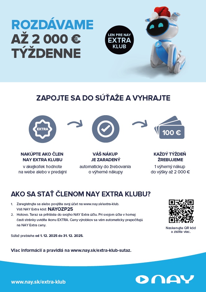 Každý EXTRA nákup v termíne od 1.12.2025 do 31.12.2025 konania súťaže je automaticky zaradený do žrebovania. Výherca získava späť hodnotu svojho nákupu vo forme darčekovej karty, a to až do výšky 2 000 €.