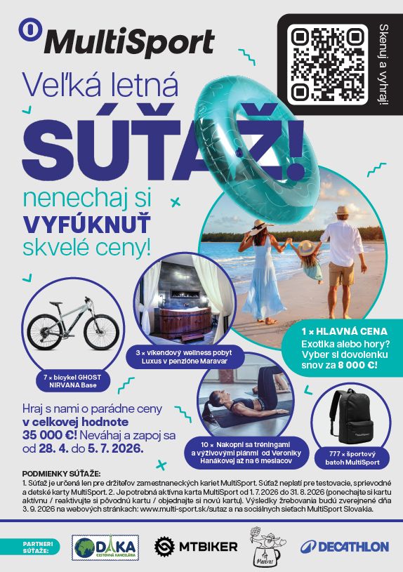 - Pre zapojenie do súťaže je potrebná aktívna karta MultiSport od 1.7. do 31.8.2026 (ponechajte si kartu aktívnu / reaktivujte si pôvodnú kartu / objednajte si novú kartu).