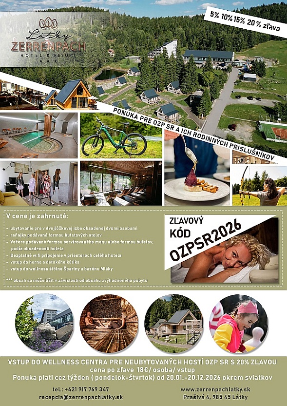 Hotel Zerrenpach Látky v spolupráci s OZP v SR ponúka pre členov OZP v SR a ich rodinných príslušníkov zľavy na pobyty v ich zariadení. Zľavový kód na uplatnenie zľavy: OZPSR2026