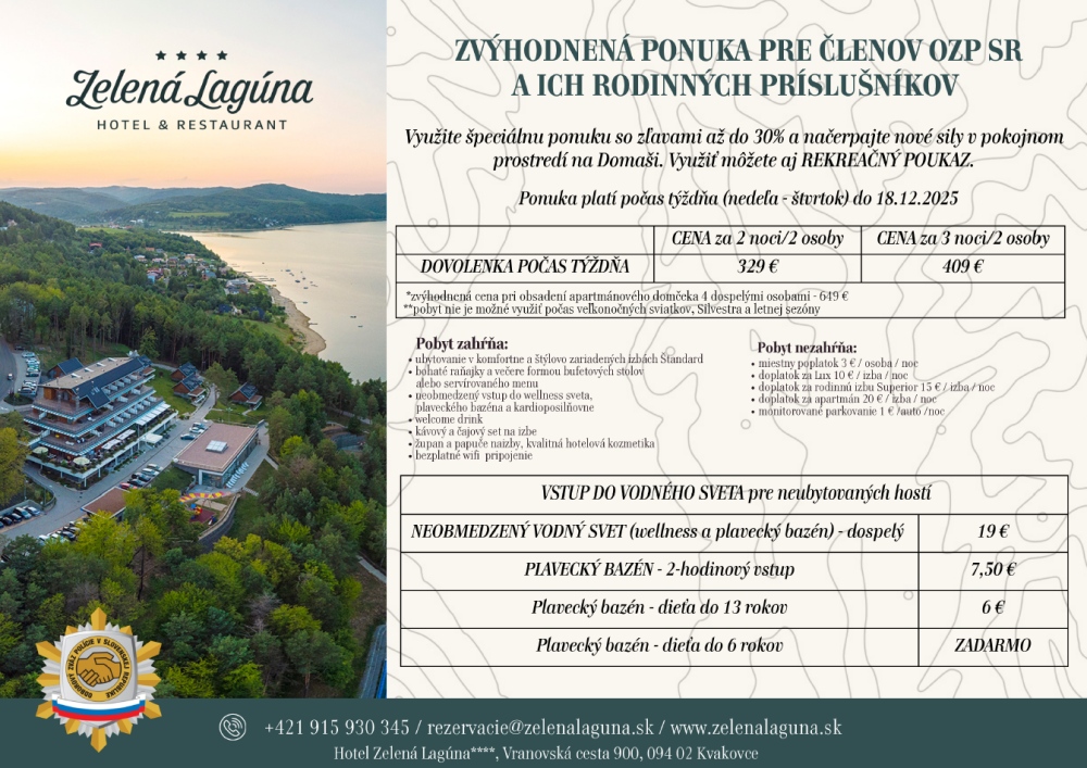 Hotel Zelená Lagúna**** ponúka pre členov OZP SR a ich rodinných príslušníkov špeciálnu ponuku so zľavami až do 30% v pokojnom prostredí na Domaši.